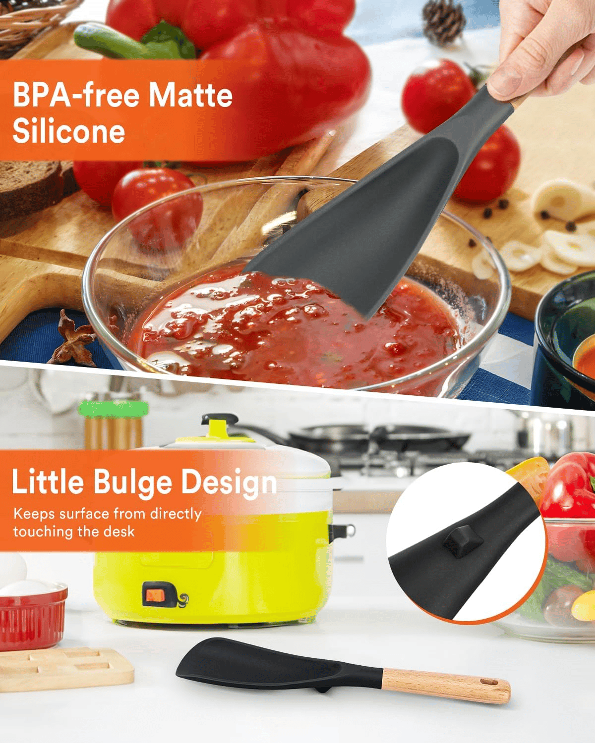 🍰👩🍳This fan-favorite 2-in-1 multi-function silicone spatula spoon is great for both cooking and serving thanks to the innovative scoop design, you can use it to break up meat as it browns, scrape and deglaze pans after searing, and then neatly serve sides and mains straight to the table.
